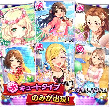 期間:2017/5/15 15:00〜2017/5/16 14:59 キュートタイプのみ登場 ! 10連ガシャはSレア以上のアイドル1人が確定で出現 ! ! ※アイドルの所属上限を超える場合、プレゼントに送られます。 レア度別提供割合 SSレアアイドル 1.5% Sレアアイドル 10% レアアイドル 88.5% スタージュエルテーブル ▲