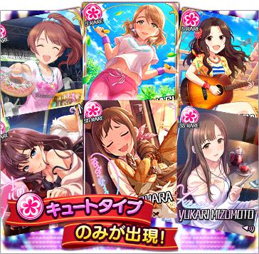 期間:2018/9/16 15:00〜2018/9/17 14:59 キュートタイプのみ登場 ! 10連ガシャはSレア以上のアイドル1人が確定で出現 ! ! ※アイドルの所属上限を超える場合、プレゼントに送られます。 レア度別提供割合 SSレアアイドル 3% Sレアアイドル 12% レアアイドル 85% スタージュエルテーブル ▲