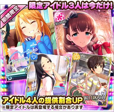 期間:2019/1/31 15:00〜2019/2/8 14:59 1日1回限定!!お得な価格で開催中のプラチナガシャを引けます。ただし、有償スタージュエルでしか引けません。※アイドルの所属上限を超える場合、プレゼントに送られます。 レア度別提供割合 SSレアアイドル 3% Sレアアイドル 12% レアアイドル 85% オススメアイドル [スウィート・ミント]結城晴 [ドランク・ロワイヤル]柊志乃 [想いプレゼント]佐久間まゆ [たっぷりクッキング]及川雫 スタージュエルテーブル ▲