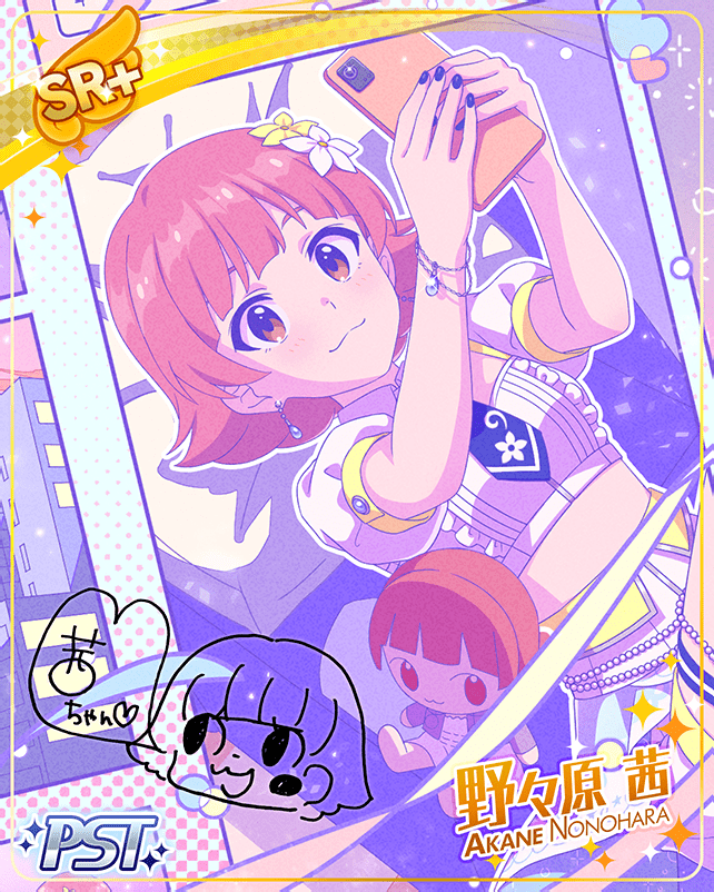 カード情報(戦友に送るメッセージ 野々原 茜) 覚醒前 覚醒後 ライフ ボーカル ダンス ビジュアル 最大 35 5658 3046 4384 覚醒最大 35 6602 3553 5114 マスターランク4 35 7394 3981 5726 センター効果 Angelチャージ Angelタイプのライフが30%アップ スキル効果(Lv最大時) 友達…だし…っ! 9秒ごとに40%の確率で4秒間、ライフが減少しない コメント カード一覧 真夏の川遊び クレシェンドブルー ホラーナイトパレード ハピ☆パラ! うざカワクィーン BRAND NEW PERFORMANCE 街を駆ける盗賊 りるきゃん ラブリー・バレンタイン フルーティ♡ベイビー UNI-ONAIR ちゃっかり猫又娘 孤島サスペンスホラー[主人公] 制服シリーズ CHALLENGE FOR GLOW-RY DAYS Heart♡・デイズ・Night☆ TRICK&TREAT ロケットスケートジャンプ! ハッピーニューイヤースマイル♪ JUSTICE!AKANECHAN! MILLION LIVE CLOSET! 合宿最後の夜 Reach 4 the Dream! 夏服シリーズ 雨上がりの君と MILLION LIVE CONFERENCE! 2人のフェスティバル バルーンに愛をこめて☆ 私たちのRainbow MILLION LIVE CLOSET! Reburn プリティ~~~ッ→ニャンニャンッ! ようこそにゃん! 分身の術! Beyond A Crossing! アリエス 耳としっぽシリーズ ときめいちゃえ大作戦 Raise a Good Sign どのポーズがお好き? モンスターっ娘シリーズ ドン・キホーテコラボ ドーリィ♡プリンセス ver.AN ミリアニセレクション 乙女の恥じらい ヴィレッジヴァンガード 7Days Smile ときにはしょんぼり コンセプト★コスチュームシリーズ ミリカン!アンコール ときめきスイートナイト AIKANE? 超々∞MUGENDAI もふもふチェンジ!シリーズ 【ANIM@L PARADISE! in Tobu Zoo】 技術者のプライド 戦友に送るメッセージ 関連画像 2018年バレンタインデー公式ツイート 2018年エイプリルミニゲーム 2018年エイプリルミニゲーム(茜ちゃん人形) ミニゲーム 「アイドルヒーローズ ジェネシス」編 2020年エイプリルフールネタ 2020年エイプリルフールネタ 3周年TOP画面 人形(熱踏!アイドルカーニバル背景) 2021年ミリシタ4周年カウントダウン(3日前) イベントSD(2022/2/2) イベントSD(2022/2/2) イベントSD #3 イベントSD #5 2022年エイプリルフールネタ 2022年ミリシタ5周年トップ画面 イベントSD #2 2023年バレンタインデートップ画面 ミリオンライブ10周年記念トップ画面 イベントSD #334