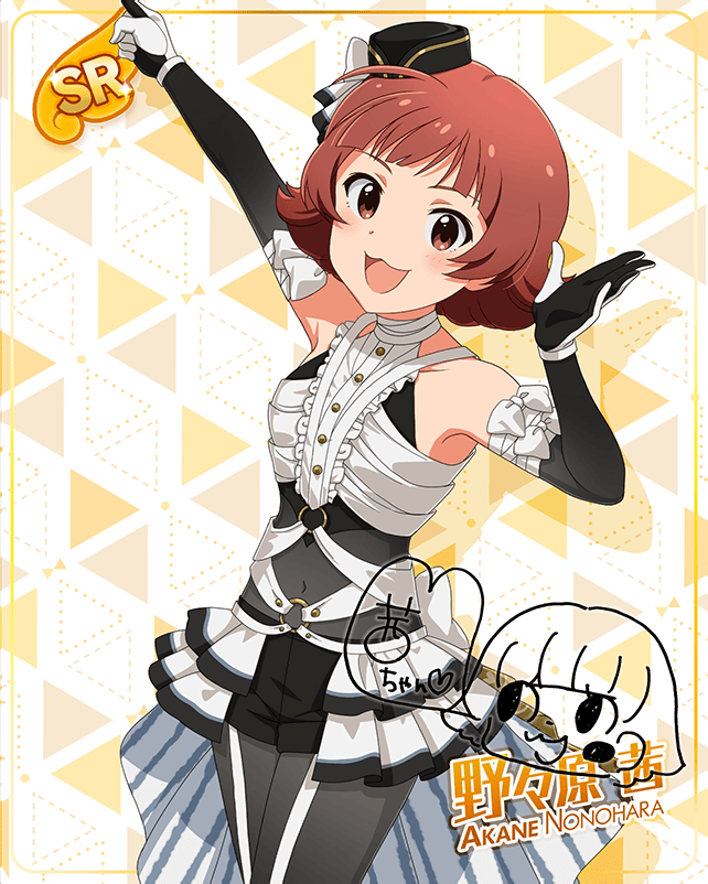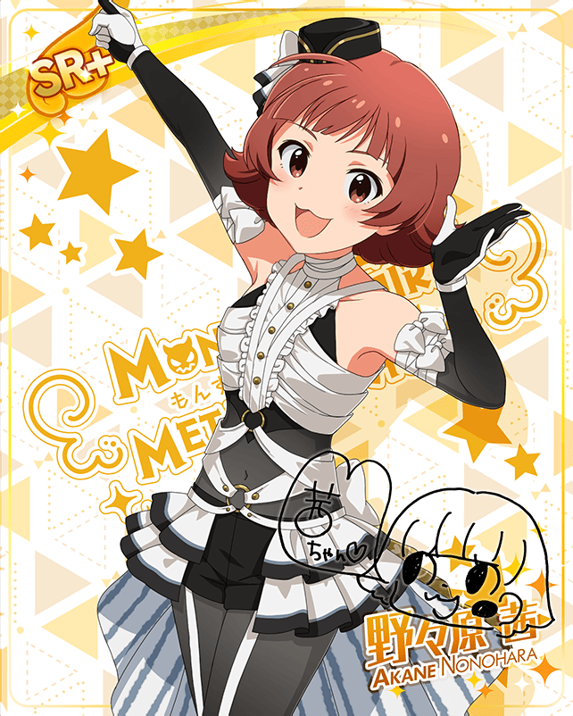 カード情報(もんすたーっ娘・めたもる!シリーズ 野々原 茜) 覚醒前 覚醒後 手に入る衣装 入手時 ライフ ボーカル ダンス ビジュアル 最大 35 4168 5388 2934 覚醒最大 35 4863 6285 3422 マスターランク4 35 5447 7041 3834 センター効果 Angelチャージ Angelタイプのライフが30%アップ スキル効果(Lv最大時) 骨抜きにしちゃうよ 11秒ごとに40%の確率で5秒間、Perfectでライフが3回復 コメント スケルトンな茜ちゃんは骨までキラキラ輝いているのです。人はそんな茜ちゃんを見てこう感じます……。「信じられない!このドキドキは、一体……♪」って。骨になっても超美少女なんて最強だね☆ カード一覧 真夏の川遊び クレシェンドブルー ホラーナイトパレード ハピ☆パラ! うざカワクィーン BRAND NEW PERFORMANCE 街を駆ける盗賊 りるきゃん ラブリー・バレンタイン フルーティ♡ベイビー UNI-ONAIR ちゃっかり猫又娘 孤島サスペンスホラー[主人公] 制服シリーズ CHALLENGE FOR GLOW-RY DAYS Heart♡・デイズ・Night☆ TRICK&TREAT ロケットスケートジャンプ! ハッピーニューイヤースマイル♪ JUSTICE!AKANECHAN! MILLION LIVE CLOSET! 合宿最後の夜 Reach 4 the Dream! 夏服シリーズ 雨上がりの君と MILLION LIVE CONFERENCE! 2人のフェスティバル バルーンに愛をこめて☆ 私たちのRainbow MILLION LIVE CLOSET! Reburn プリティ~~~ッ→ニャンニャンッ! ようこそにゃん! 分身の術! Beyond A Crossing! アリエス 耳としっぽシリーズ ときめいちゃえ大作戦 Raise a Good Sign どのポーズがお好き? モンスターっ娘シリーズ ドン・キホーテコラボ ドーリィ♡プリンセス ver.AN ミリアニセレクション 乙女の恥じらい ヴィレッジヴァンガード 7Days Smile ときにはしょんぼり コンセプト★コスチュームシリーズ ミリカン!アンコール ときめきスイートナイト AIKANE? 超々∞MUGENDAI もふもふチェンジ!シリーズ 【ANIM@L PARADISE! in Tobu Zoo】 技術者のプライド 戦友に送るメッセージ SPECIAL SOLO RECORDS ダウンタウンガールシリーズ もんすたーっ娘・めたもる!シリーズ 関連画像 2018年バレンタインデー公式ツイート 2018年エイプリルミニゲーム 2018年エイプリルミニゲーム(茜ちゃん人形) ミニゲーム 「アイドルヒーローズ ジェネシス」編 2020年エイプリルフールネタ 2020年エイプリルフールネタ 3周年TOP画面 人形(熱踏!アイドルカーニバル背景) 2021年ミリシタ4周年カウントダウン(3日前) イベントSD(2022/2/2) イベントSD(2022/2/2) イベントSD #3 イベントSD #5 2022年エイプリルフールネタ 2022年ミリシタ5周年トップ画面 イベントSD #2 2023年バレンタインデートップ画面 ミリオンライブ10周年記念トップ画面 イベントSD #334 イベントSD #407