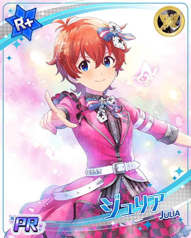 カード情報(SPECIAL SOLO RECORDS ジュリア) 覚醒前 覚醒後 ライフ ボーカル ダンス ビジュアル 最大 覚醒最大 マスターランク4 センター効果 スキル効果(Lv最大時) コメント カード一覧 Rock of dawn シャイニングワールド 基本が大事! 恥じらいお雛様 エターナルハーモニー BRAND NEW PERFORMANCE はにかみパレオ D/Zeal 迎春プレイヤー ヒーローズ・ジェネシス UNI-ONAIR 熱闘!ビーチバレー 制服シリーズ 小さなオーケストラ アイドル修行ポーズ編 漆黒の狙撃手 MILLION LIVE CLOSET! CHALLENGE FOR GLOW-RY DAYS 在りし日の歌姫 彼方を舞う、餞の鳥 流星群 エレガンスバトラー 止まらないディスティニー Reach 4 the Dream! 夏服シリーズ ダイナミックに突き進め! MILLION LIVE CONFERENCE! 黒の剣士 素顔のプリンセス LOVERS HEART 女の子の憧れ 私たちのRainbow 26時のマリンブルー わくわくがいっぱい! ver.J MILLION LIVE CLOSET! Reburn Beyond A Crossing! 退屈からエスケープ! -World Wide Meal- MILLION DINER Raise a Good Sign 耳としっぽシリーズ 楽天イーグルス 原点巡礼 ミリカン!アンコール モンスターっ娘シリーズ ミリアニセレクション アツいのはお好き? MILLIONSTARS Team7th 7Days Smile I will achieve. アイル プラリネ 炎の導き手 艶やか演歌道 アロー彗星 コンセプト★コスチュームシリーズ 超々∞MUGENDAI もふもふチェンジ!シリーズ SPECIAL SOLO RECORDS 関連画像 2018年バレンタインデー公式ツイート 2018年エイプリルミニゲーム 2019年ホワイトデートップ画面 2018年ミリシタ感謝祭 ミニゲーム 「アイドルヒーローズ ジェネシス」編 2020年エイプリルフールネタ 2020年エイプリルフールネタ 3周年TOP画面 2021年ミリシタ4周年カウントダウン(4日前) イベントSD #3 2022年エイプリルフールネタ イベントSD #2 イベントSD #4 ミリオンライブ10周年記念トップ画面 イベントSD #10 イベントSD #366 イベントSD #387 2025年ミリシタ8周年カウントダウン(2日前)
