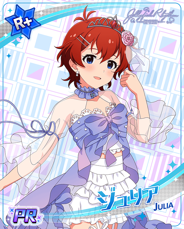 ジュリア #1 #2 #3 #4 #5 #6 #7 #8 #9 #10 #11 #12 #13 #14 #15 #1 #2 #3 #4 #5 #6 #7 #8 SRサイン SSRサイン ネーム なまえじゅりあ タイプFAIRY 身長157cm 体重43kg 血液型O型 年齢16歳 誕生日9月26日(天秤座) 利き手左利き スリーサイズ79 / 54 / 80 出身地福岡県 趣味なし 特技ギター 好きなものパンクロック CV愛美 所属765プロダクション オフショット 4コマ 劇場ホワイトボード ログインボーナス落書