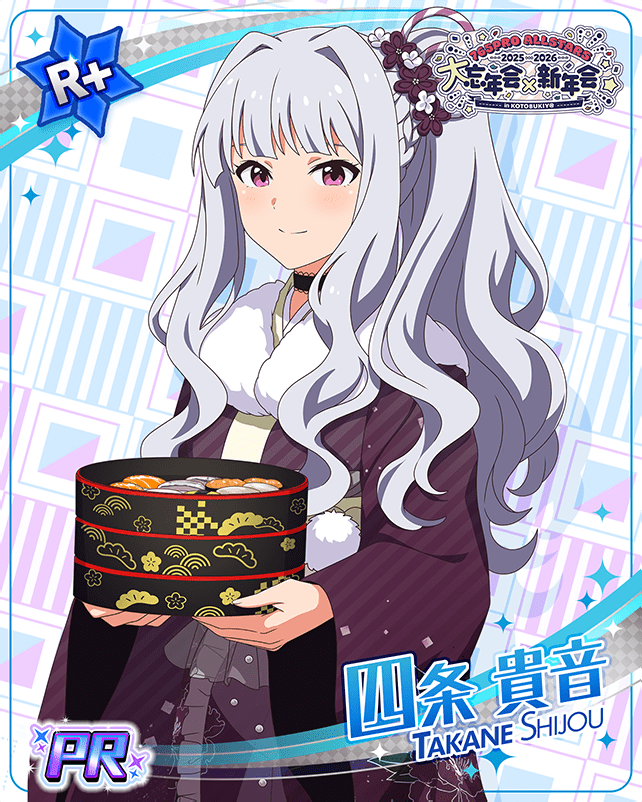 カード情報(大忘年会×新年会 in KOTOBUKIY@ 四条 貴音) 覚醒前 覚醒後 ライフ ボーカル ダンス ビジュアル 最大 覚醒最大 マスターランク4 センター効果 スキル効果(Lv最大時) コメント カード一覧 望郷の想い 優雅なひととき 水面に浮かぶ月 スノーファンタジーナイト セクシー魔女っ娘 麗しきエルディスト BRAND NEW PERFORMANCE 月のごとく輝く UNI-ONAIR 制服シリーズ 私のお気に入り 夜空に瞬いて 可愛い挑戦状 エレガント・リング CHALLENGE FOR GLOW-RY DAYS フラワーガール EVERYDAY WAVE!! MILLION LIVE CLOSET! Reach 4 the Dream! BRIGHT DIAMOND 聖なる夜は長く、深く 夏服シリーズ ショコラステージ 2人だけの春宵 MILLION LIVE CONFERENCE! 私たちのRainbow 怪盗たちの攻防戦 ver.TS 落葉の秋景色 耳としっぽシリーズ おとぎの国の物語[偉大なる魔法使い] Beyond A Crossing! addicted MILLION LIVE CLOSET! Reburn Raise a Good Sign 現代伝奇ホラー<医師> いざ実食! ミリカン!アンコール 新宿マルイ メン モンスターっ娘シリーズ ミリアニセレクション 7Days Smile ミリオンライブ野郎ラーメン はにかみ帰り道 淡く、霞かかる月 ステラ コンセプト★コスチュームシリーズ もふもふチェンジ!シリーズ CAMPAI♡NIGHT HUB One Day 体験 超々∞MUGENDAI 秘密の約束 紅のひとりごと PIZZA-LA 大忘年会×新年会 in KOTOBUKIY@ 関連画像 2018年バレンタインデー公式ツイート 2019年エイプリルミニゲーム ココスコラボ 2020年エイプリルフールネタ 2020年エイプリルフールネタ 3周年TOP画面 2021年ミリシタ4周年カウントダウン(3日前) 2021年ミリシタ4周年トップ画面 ユニットトークイメージ(2021-07-29~) ユニットトークイメージ(2021-07-29~) イベントSD 2022年エイプリルフールネタ イベントSD #6 2023年ホワイトデートップ画面 イベントSD #7 イベントSD #8 イベントSD #358