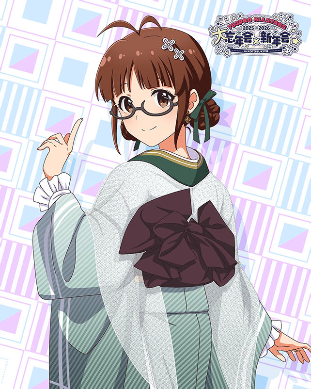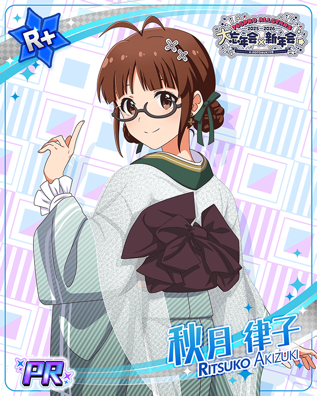 カード情報(大忘年会×新年会 in KOTOBUKIY@ 秋月 律子) 覚醒前 覚醒後 ライフ ボーカル ダンス ビジュアル 最大 覚醒最大 マスターランク4 センター効果 スキル効果(Lv最大時) コメント カード一覧 夢のお出迎え プライベートスナップ タイムトラベラー ラストチェック きらめきミュージアム BRAND NEW PERFORMANCE 知性派ハイカラ娘 UNI-ONAIR 万全のサポ-ト 気付いて!乙女ゴコロ スポットライトの向こうに 制服シリーズ 私たちのコンチェルト♪ CHALLENGE FOR GLOW-RY DAYS エンゲージメント・ダンス クリスマスのお手伝い DOKI♡DOKI♡SHOT! ARMooo MILLION LIVE CLOSET! 水着は支度済み! Reach 4 the Dream! MILLION LIVE CONFERENCE! 夏服シリーズ Liar's good bye 豪華な優勝賞品 YES or YES? 私たちのRainbow MILLION LIVE CLOSET! Reburn いたずらもみじ ShineLight いっぱいいっぱい Beyond A Crossing! 耳としっぽシリーズ Raise a Good Sign 「私」が変わる瞬間 Our New year's "Eve" ソル ミリカン!アンコール ミリアニセレクション モンスターっ娘シリーズ 7Days Smile SMOKING HOT♡ ふたりの年越しそば 成田ゆめ牧場コラボ おもちゃたちの脱走劇! ver.RA 英明なる呉大帝 コンセプト★コスチュームシリーズ 超々∞MUGENDAI Discord Area 仲良しお月見ソング PIZZA-LA アイドルマスター × 自遊空間コラボ もふもふチェンジ!シリーズ 大忘年会×新年会 in KOTOBUKIY@ 関連画像 2018年バレンタインデー公式ツイート 2019年エイプリルミニゲーム 2020年エイプリルフールネタ 2020年エイプリルフールネタ 3周年TOP画面 2021年ミリシタ4周年カウントダウン(3日前) イベントSD #4 イベントSD #2 イベントSD #3 イベントSD #4 2022年エイプリルフールネタ 2022年ミリシタ5周年カウントダウン(2日前) イベントSD #6 イベントSD #8 イベントSD #325 アイドルマスター×成田ゆめ牧場 みんなとすごす成田ゆめ牧場 ~穴掘りの頂点を目指しますぅ!~